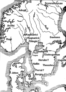 Bild: Scandza, Skandinavien um 550 n. Chr. nach Jordanes, einem wenig zuverlässigen römisch-gotischen Gelehrten und Geschichtsschreiber des 6. Jahrhunderts