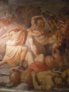 Bild: Kampf der Hermunduren und Katten um die Salzquellen bei Kissingen 58 nach Christo (Detail), gemalt von Georg Hiltensperger jun., 19. Jhd., Staatliches Museum für Völkerkunde München