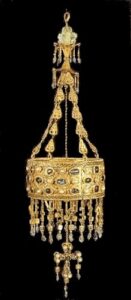 Bild unten: Krone von Rekkeswinth, König der Westgoten. Er regierte vom 20. Januar 649 (als Mitregent seines Vaters) bzw. 30. September 653 (als Alleinherrscher) bis zu seinem Tod.